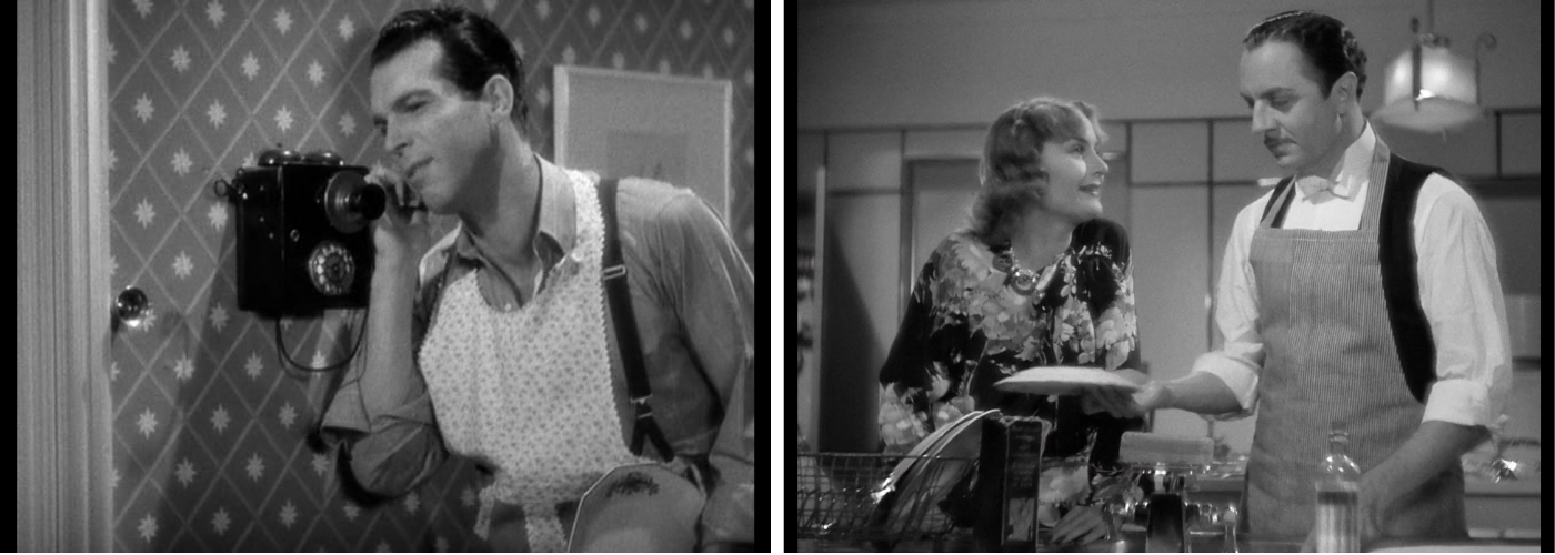 Si les femmes travaillent, il faut bien que quelqu’un s’occupe de la maison et les hommes peuvent donc régulièrement être vus la vaisselle à la main ou en train de préparer le repas. Ce changement de place est souvent mis en avant par un tablier, comme dans Mon homme Godfrey ou Jeux de mains. Dans ces deux films, une différence est d’ailleurs à prendre en compte : Theodore reste dans l’appartement de Regi car il ne veut pas travailler et attend donc que son soi-disant voyage dans une autre ville soit fini pour retrouver sa fortunée fiancée. Godfrey du film éponyme est quant à lui employé chez les Bullocks où il remplace la servante absente. Faire la cuisine ou la vaisselle ne rabaisse pas les hommes et ils restent attractif auprès des héroïnes qui sont souvent incapable ou trop fatiguée pour le faire elle-même. Dans La Femme de l’année (Woman of the Year, George Stevens, 1942), la journaliste a succès tente, pour récupérer son mari, de lui préparer le petit déjeuner. Mais, du café qui déborde aux tartines qui tombent sur le sol jusqu’à la pâte à gaufre qui menace d’exploser, il est clair qu’elle n’est pas faite pour jouer les “femmes au foyer”.