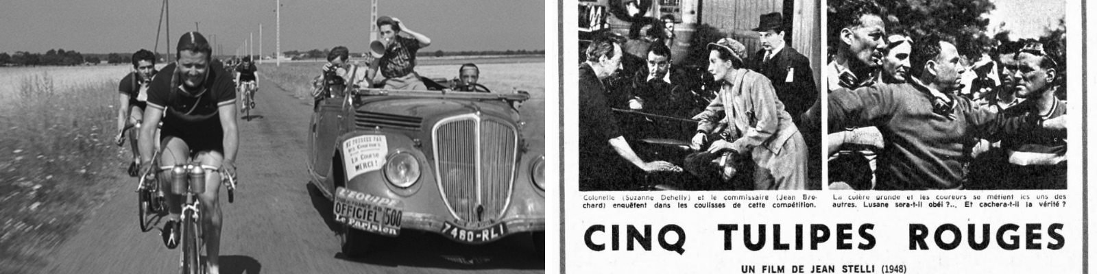 L’intrigue se déroule durant le Tour de France alors qu’un mystérieux assassin s’en prend à différents coureurs, signant ses crimes d’une tulipe rouge. Pour mener l’enquête, l’inspecteur Ricoul (Jean Brochard) doit suivre les étapes du Tour, accompagné d’ une journaliste sportive que tout le monde nomme “Colonelle” (Suzanne Dehelly). Filmé durant le véritable Tour de France de 1949, étapes après étapes, mêlant images d’archives et pures images de fiction, le film de Stelli mélange assez habilement histoire policière et comédie. Le tout est porté par l’incroyable Suzanne Dehelly, actrice dont le nom ne dit plus grand chose au public aujourd’hui. Pourtant, elle est bien celle qui apporte au film de Jean Stelli toute sa saveur avec un personnage fort, respecté et dont les répliques sont souvent un vrai délice. Il est vrai que découvrir qui est l’assassin n’est pas très difficile lorsqu’on est habitué au genre policier néanmoins, la fin n’en reste pas pour le moins étonnante, flirtant même avec un film d’Hitchcock ! Nous passons donc un très agréable moment devant le film et dès l’apparition du mot “fin” sur l’écran, nous nous promettons de regarder de plus près la carrière de Suzanne Dehelly qui clôture les Cinq tulipes rouges en s’éloignant de la caméra, l’air à la fois mélancolique et résignée